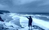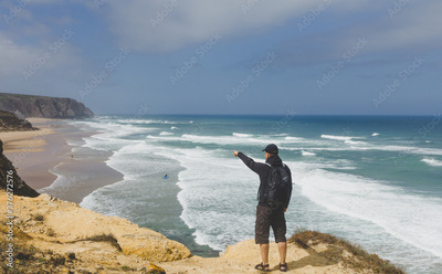 A tourist on a rocky shore looks in the distance at the raging ocean and surfers. Atlantic Ocean. Portugal.