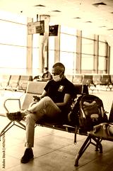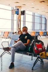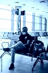 Airport attractive old man tourist boarding plane taking a flight wearing face mask. Coronavirus flu virus travel concept banner panorama.