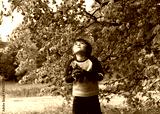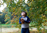 Portrait Active kid holding autumn leaves ready to throw in the air, Happy child playing under big tree, Cute little boy wearing jumper playing outside in Autumn park.