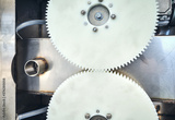 Close up of two plastic meshing gears transmitting rotational motion of a machine.