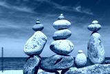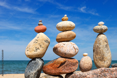 Several Rock zen pyramids of colorful pebbles on a beach on the background of the sea. Concept of balance, harmony and meditation.