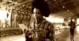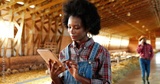 Young African American pretty woman using tablet device and thinking in farm stable. Female farmer tapping and scrolling on gadget computer in shed. Man speaking on phone on background.