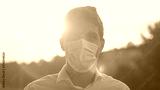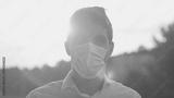 PORTRAIT: Millennial male looks into the camera while wearing a surgical mask.