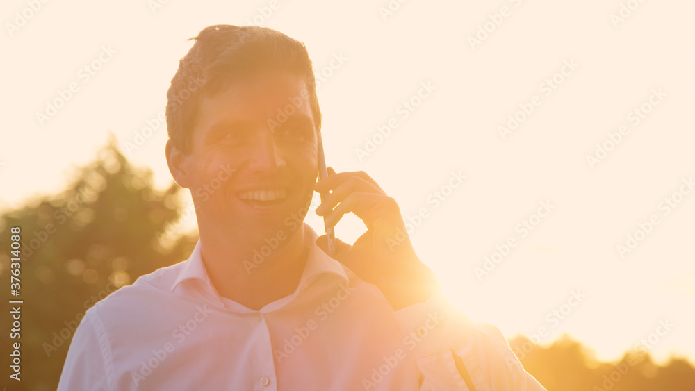 CLOSE UP: Man cheerfully talks on the phone on sunny evening after good meeting.