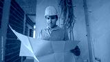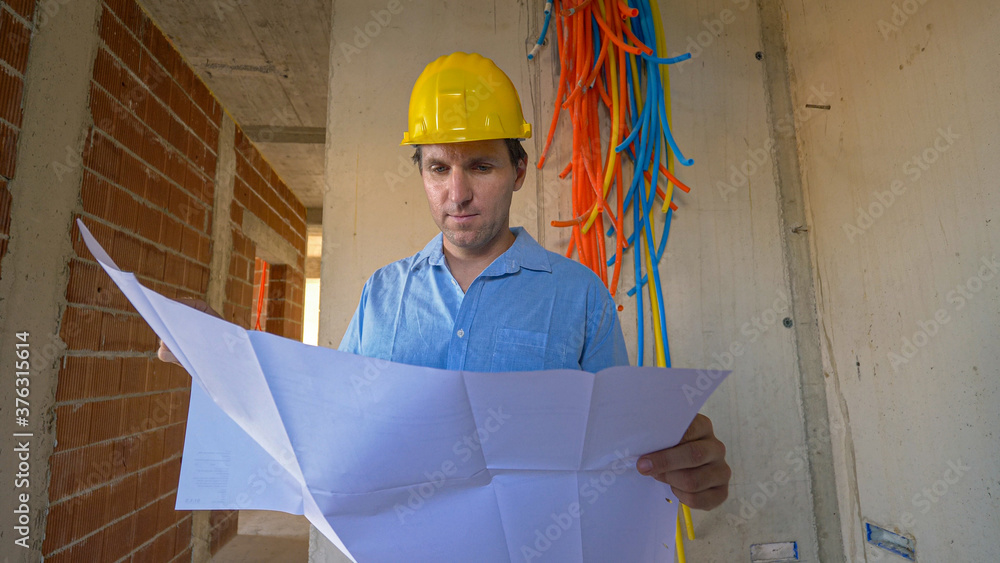 CLOSE UP: Focused electrician looks at floor plans while checking installations.