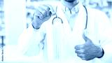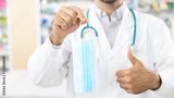 Close up hand of male pharmacist hold protective hygienic mask to prevent infection to customers in modern pharmacy
