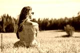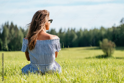 Woman wearing dress sitting on green grass field