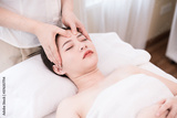 Young Asian woman getting spa massage treatment at beauty spa salon. Face massage, Relaxing massage, Spa skin and body care