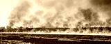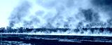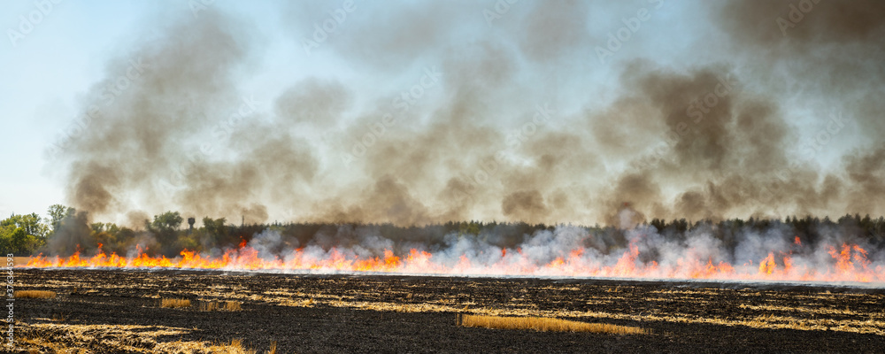 Wildfire on wheat field stubble after harvesting near forest. Burning dry grass meadow due arid climate change hot weather and evironmental pollution. Soil enrichment with natural ash fertilizer