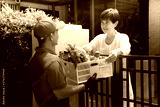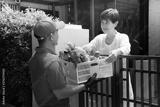 Asian delivery man in red uniform delivering groceries box of food, fruit, vegetable and drink to woman recipient at home