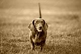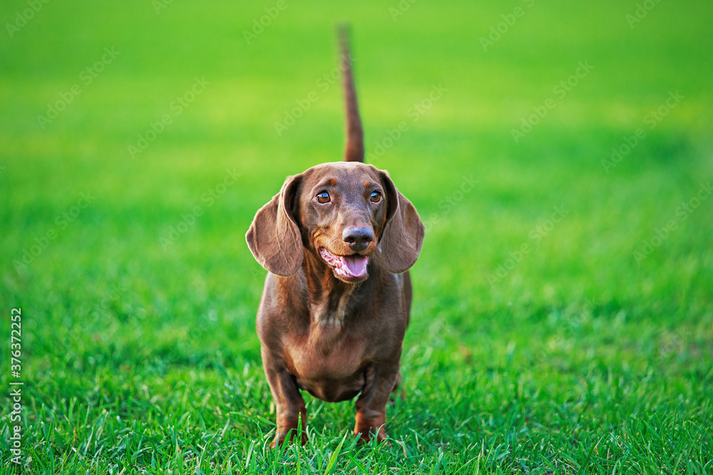 a brown Dachshund stands on the grass.Dog in the Park.Cute dog on a green grass background