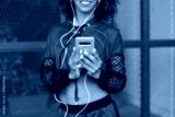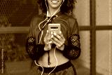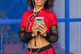 Black urban stylish female dancer using smartphone for listening music outside.