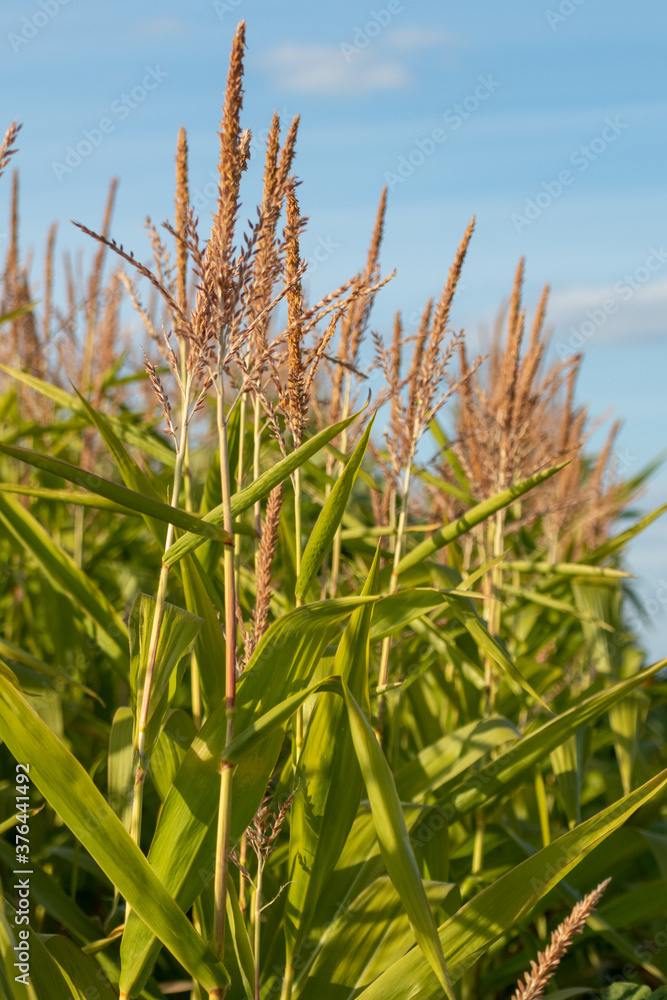 Corn in the corn field, Green corn field close-up with blue sky, Organic agriculture food plantation. Vertical