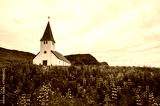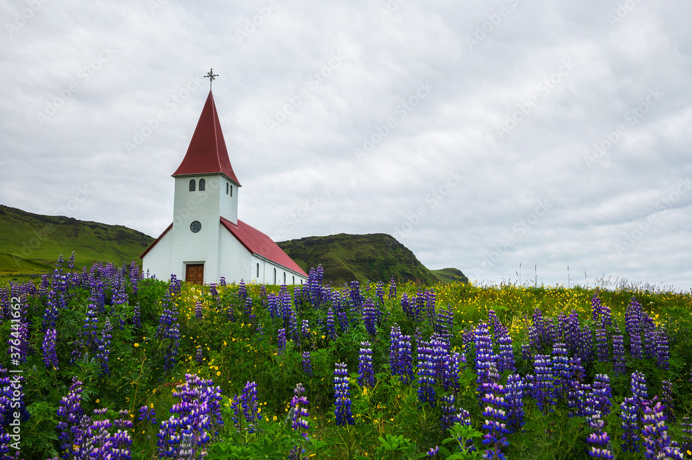 Church surrounded with blooming lupine flowers in Vik, Iceland