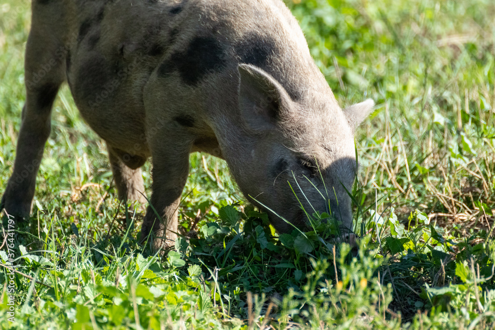 Little dotted baby pig playing eating grass. Close-up piglet feeding in green sunny grass farm field