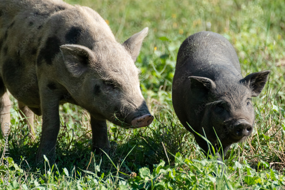 Little cute baby pigs playing in summer lawn. Black and dotted piglets feeding in green sunny grass farm field