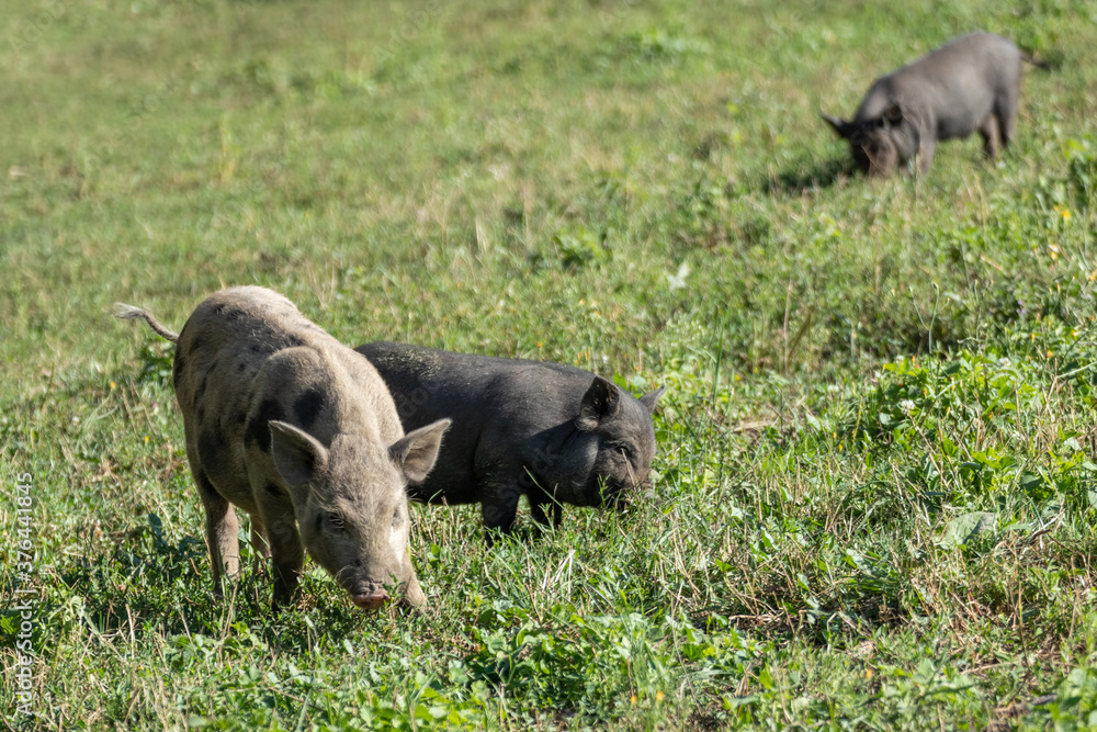 Little cute baby pigs feeding in summer field. Funny piglets feeding in green sunny grass farm field