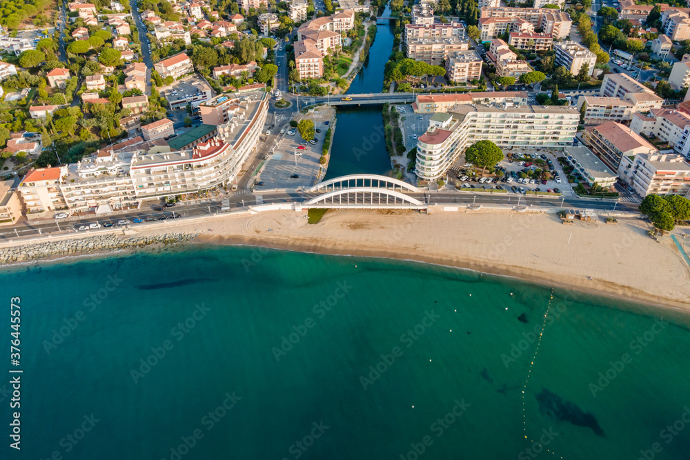 Aerial view of Sainte-Maxime seafront and its famous bridge in French Riviera (South of France)