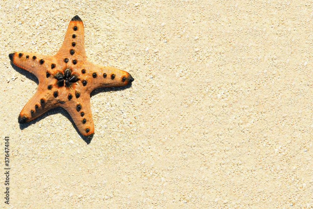 Isolated view of one orange colored horned sea star lying on the sandy beach at Honda Bay, Palawan Province, Philippines