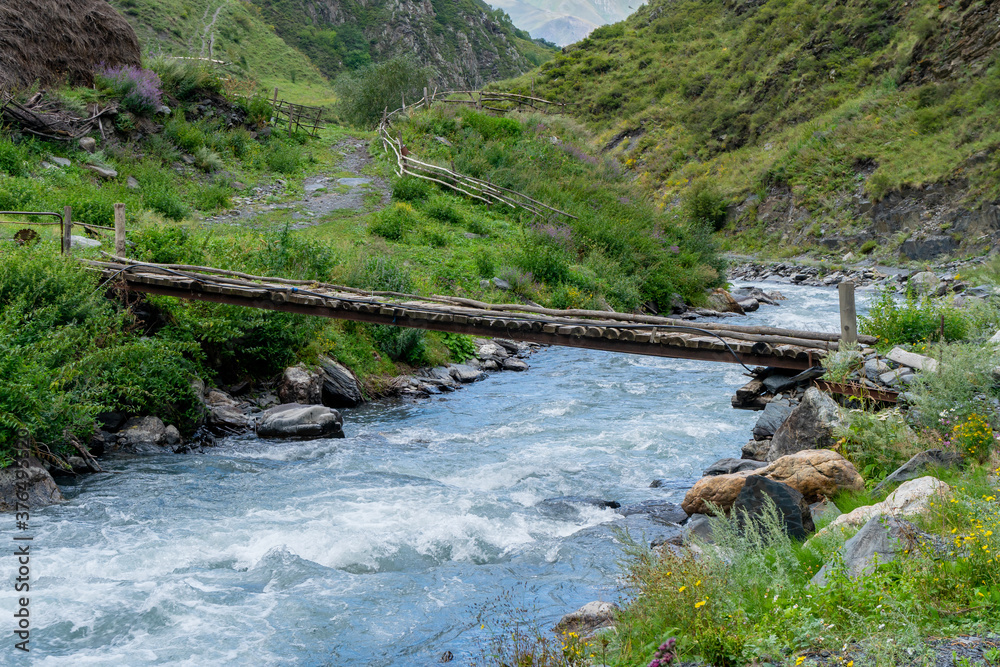 Old wooden bridge over a river Argun in Upper Khevsureti, Georgia