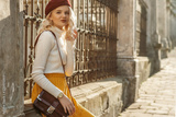 Outdoor autumn portrait of fashionable woman wearing stylish outfit: beret, white turtleneck, yellow skirt, wrist watch, with shoulder bag, posing in street of European city. Copy, empty space
