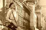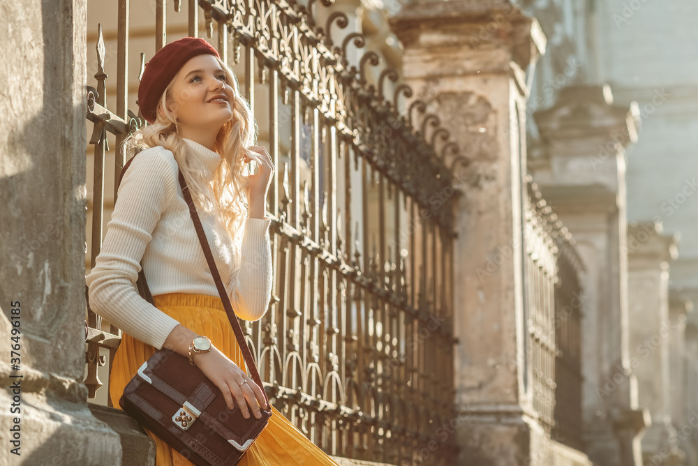 Outdoor autumn portrait of happy smiling woman looking up, wearing stylish outfit: beret, white turtleneck, yellow skirt, wrist watch, with shoulder bag, posing in street of European city. Copy space
