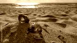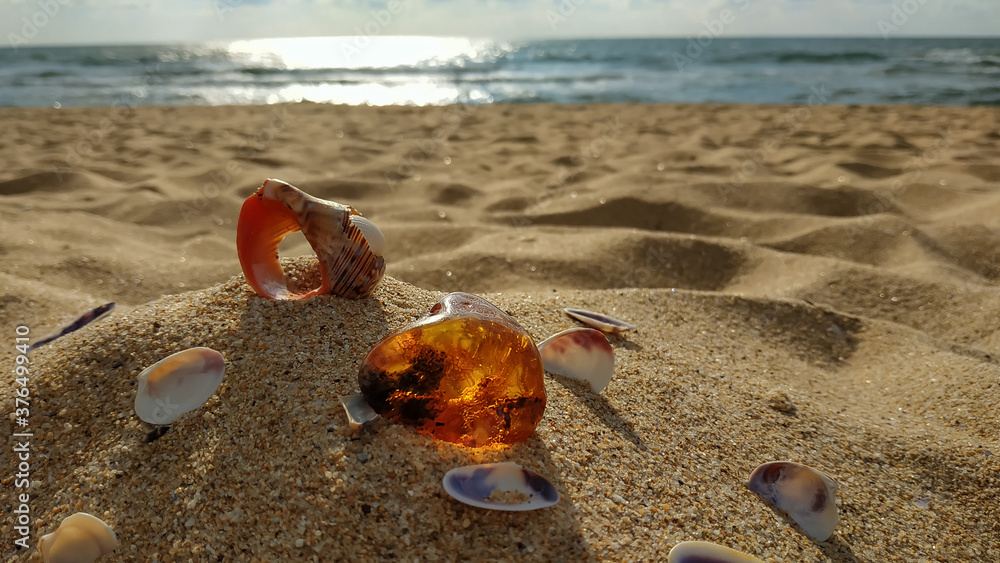 A piece of raw sparkling Baltic amber and seashells large and small on the sand against the sea. Early summer morning.