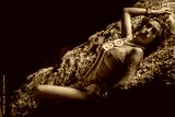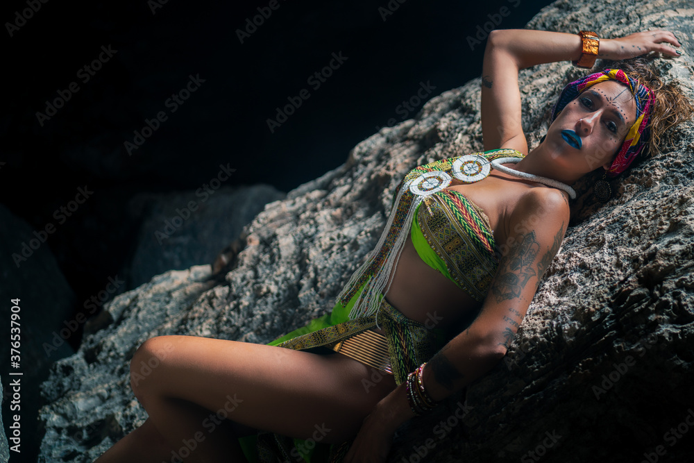Beautiful woman dressed as Egyptian princess lying on a rock, with a black background
