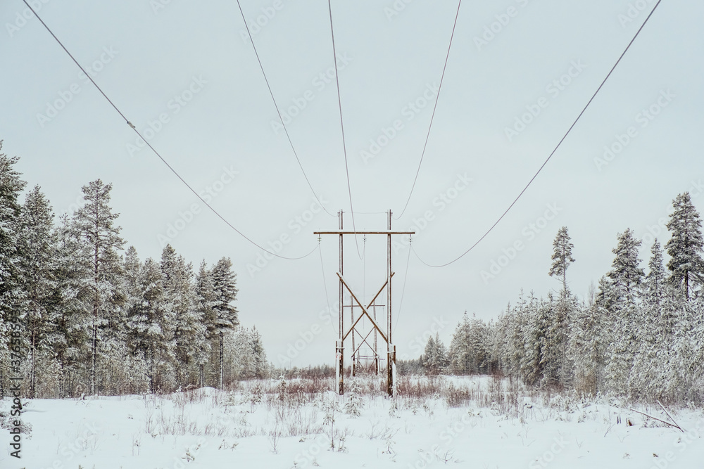 Winter landscape power lines in a snowy field in the forest