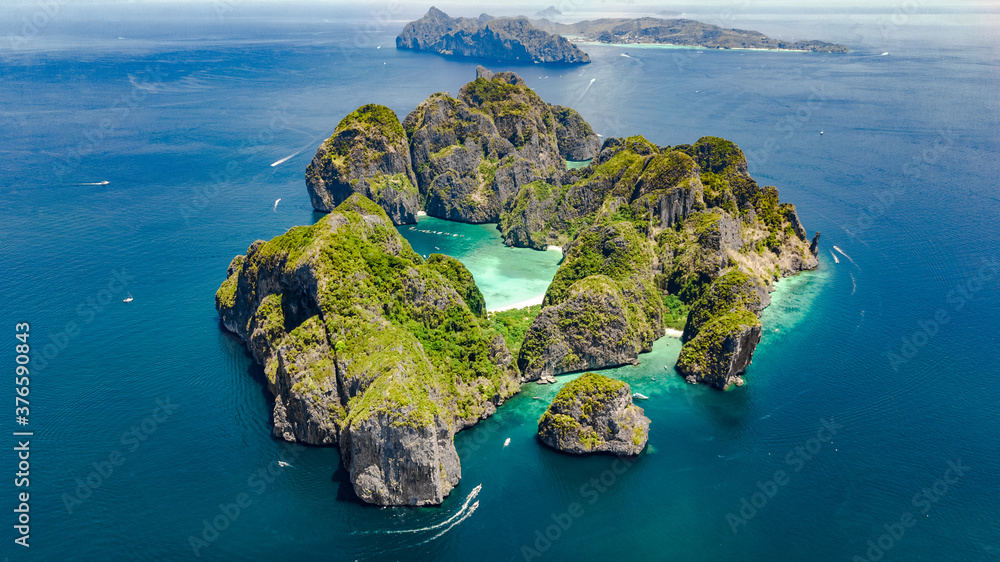 Aerial drone view of tropical Ko Phi Phi island, beaches and boats in blue clear Andaman sea water from above, beautiful archipelago islands of Krabi, Thailand