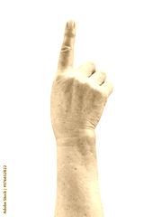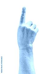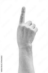Ederly woman hand with wrinkled clearly visible veins pointing finger to top Old lady arms freckles Isolated with clipping path is on white background