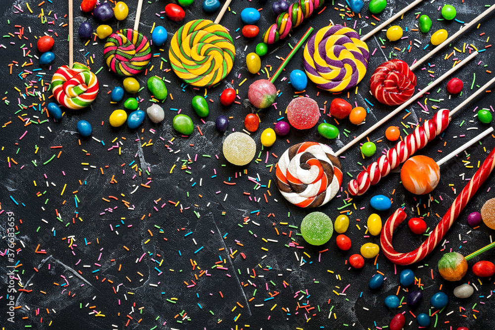 Colored lollipops, sweets,candy, sprinkles on a black stone background. Top view, flat lay.
