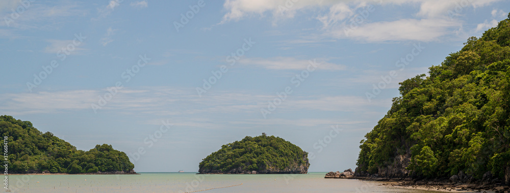 Panoramic cover background of Landscape island with blue sky and tiny clouds in Thailand,Nature banner cover concept.