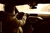 Back view of female driver in winter coat transporting on wild northern are by car with winter wheels,woman traveler exploring nordic natural landmarks on automobile