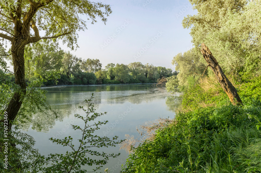 Panoramic view of the Tiber river in the countryside outside the city of Rome