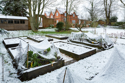 Winter vegetable garden in snow, UK