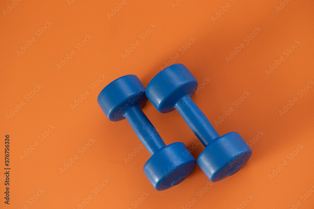 a pair of blue dumbbells on orange background. copy space. horizontal