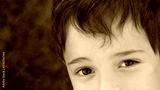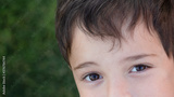 Child's eyes. A positive emotion. Kid's look. Close up. Eye contact. Part of the face is visible. Caucasian. Children's vision, childhood concept. Daylight. Green grass on the background.