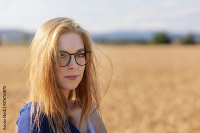 Portrait of young woman wearing glasses is posing in corn field Horizontally.