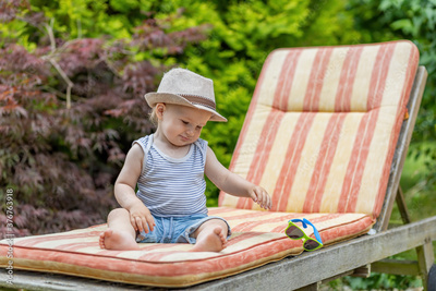 Baby boy is throwing away sunglasses sitting on the deck chair in the garden.