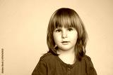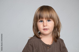 Portrait of cute boy with long thick hair. The child has blue eyes, brown hair, thick bangs. He is in a brown t-shirt. Cheerful kid smiling. Caucasian. Looks at the camera. Studio, gray background.