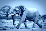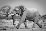 Young elephant bull walking fast with beautiful tree and blue sky in the background in Savuti in Botswana