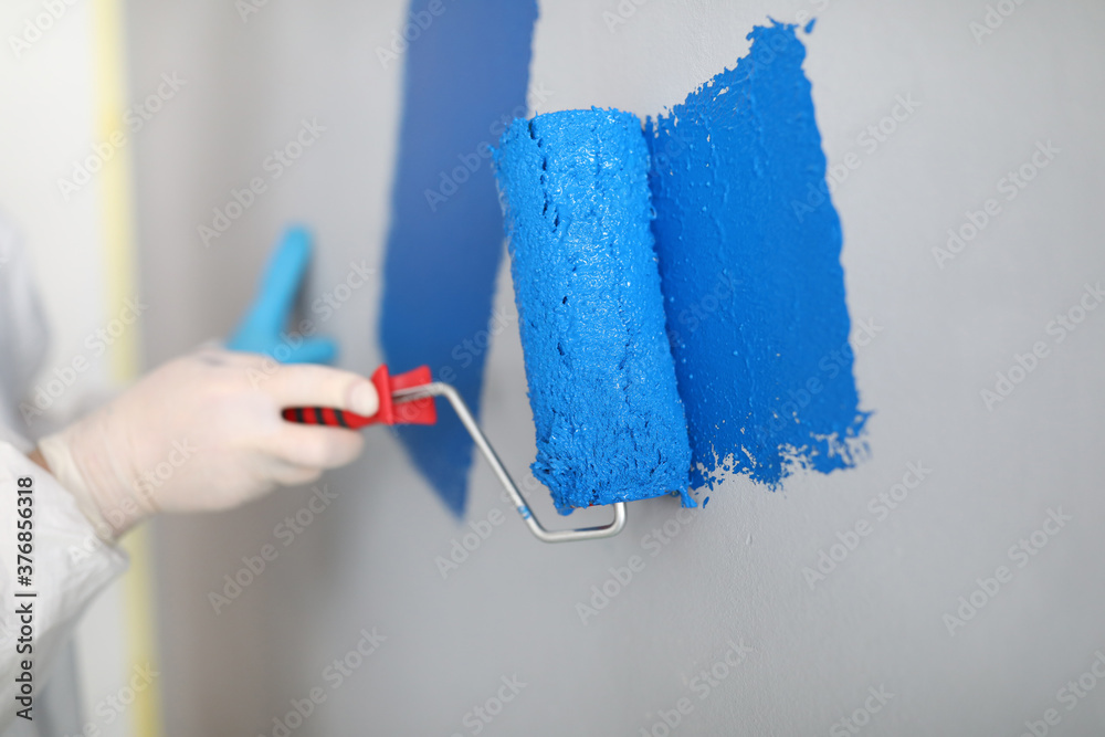 Craftsman holds roller and paints white wall blue. Painter services concept