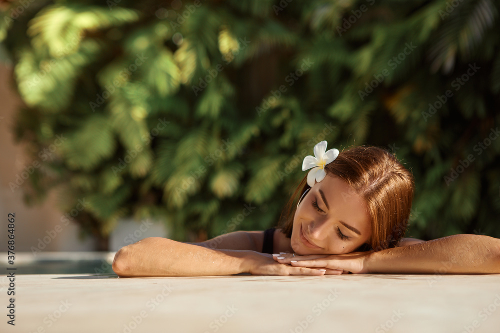 Beauty and body care. Sensual young woman relaxing in outdoor spa swimming pool with flower in the hair