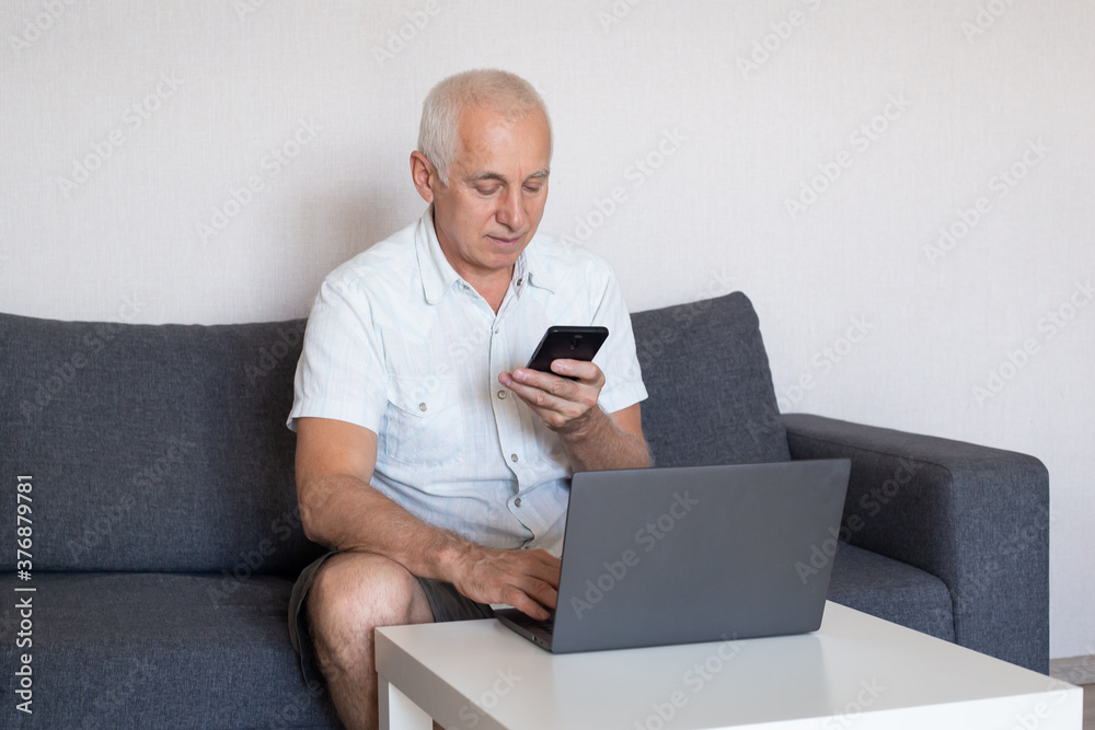 Senior man using mobile phone while working in home office