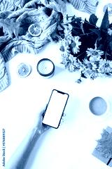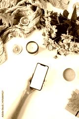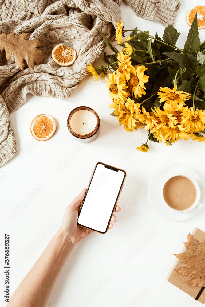 Women hand hold smartphone. Home office table desk workspace. Flat lay, top view girl boss business concept. Blanket, flowers bouquet, leaves, coffee cup. Template for social media.