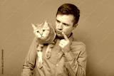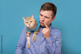 Caucasian young man holding a british cat scolding him for prank