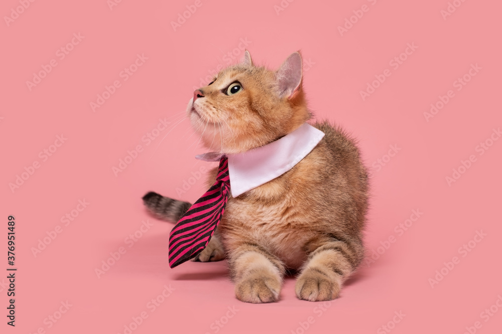 British cat wearing a tie sitting and looking aside