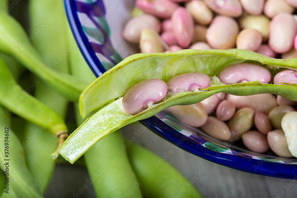 Preparando alubias tiernas y judías verdes en la mesa de la cocina para una comida sana