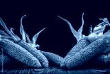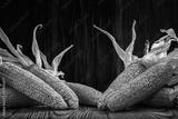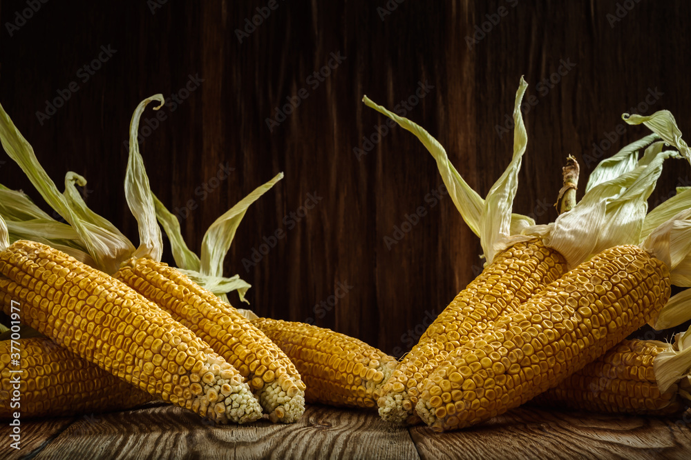 dry corn cobs with husks on rough boards on a dark wooden background. seasonal autumn rustic concept